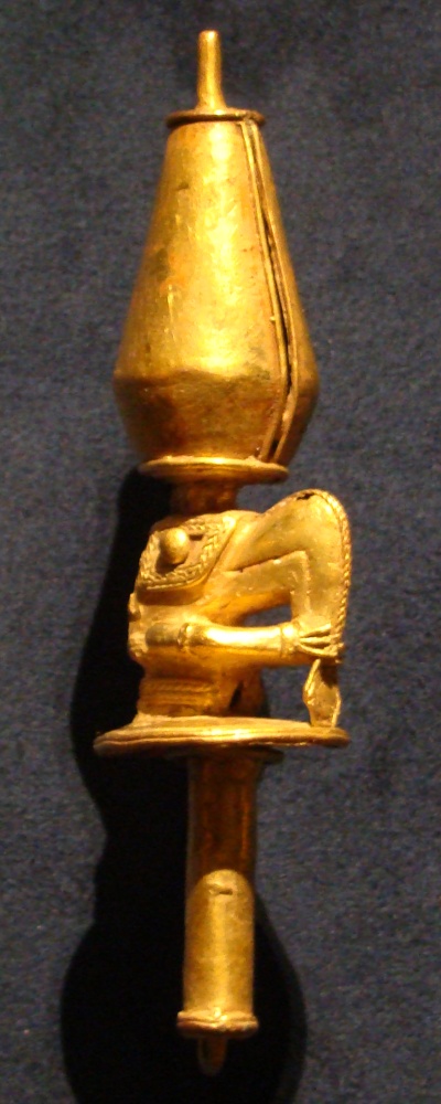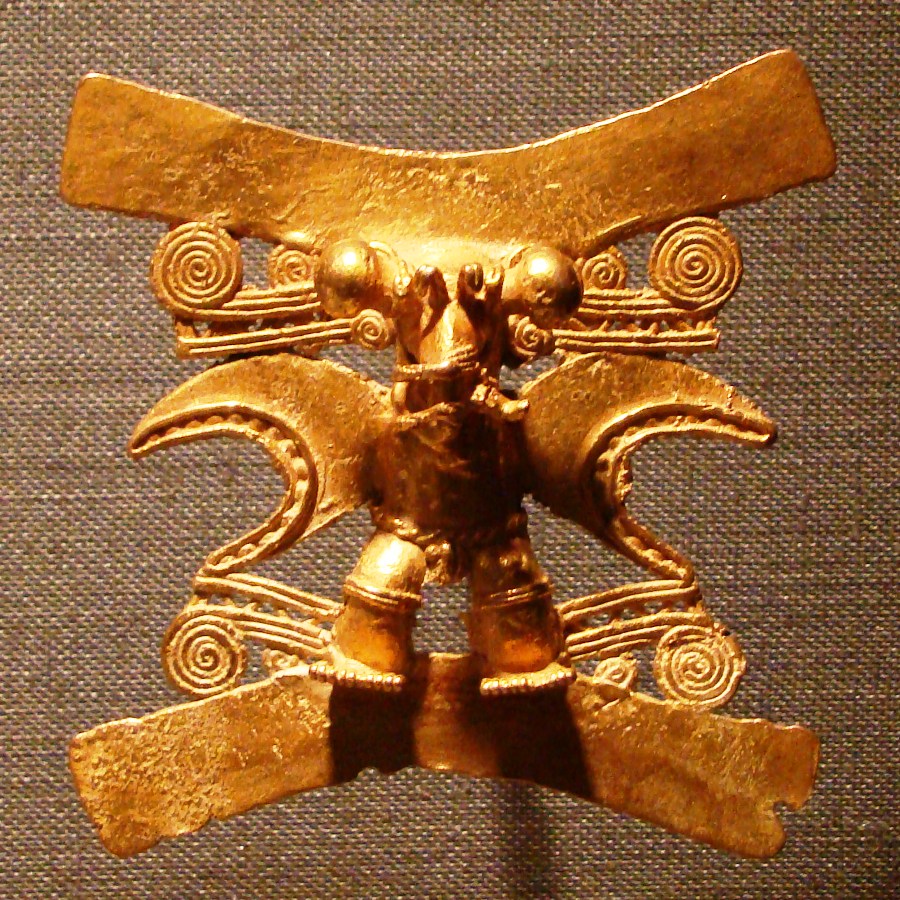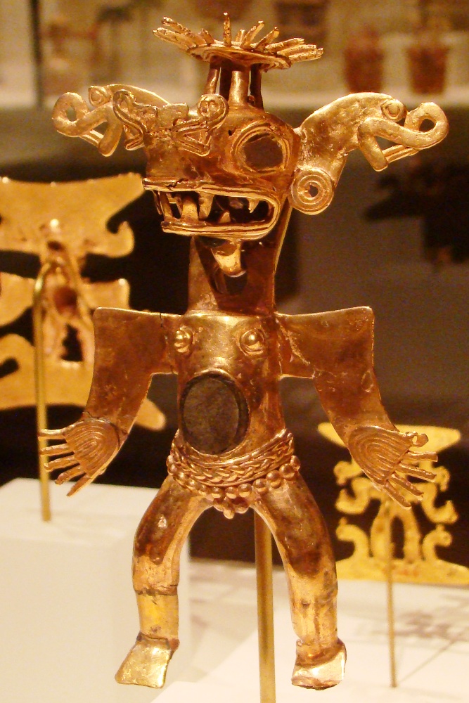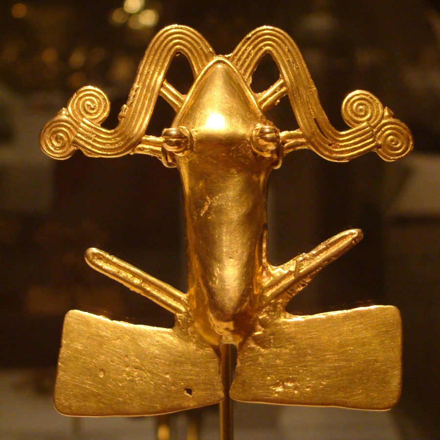 Some of the most marvelous pieces of ancient American gold art comes from the Chiriquí of Panama. (Even the Maya of Chich'én Itzá were so impressed with their quality that they requested it for their funerary offerings!) The wonderful frog at left spews streams in filigree from its mouth, which points to the water symbolism that many native peoples associated with frogs. Some frogs and toads produced hallucinogenic substances that shamans may have used to induce their visionary trances, which could contribute to their sacred quality.