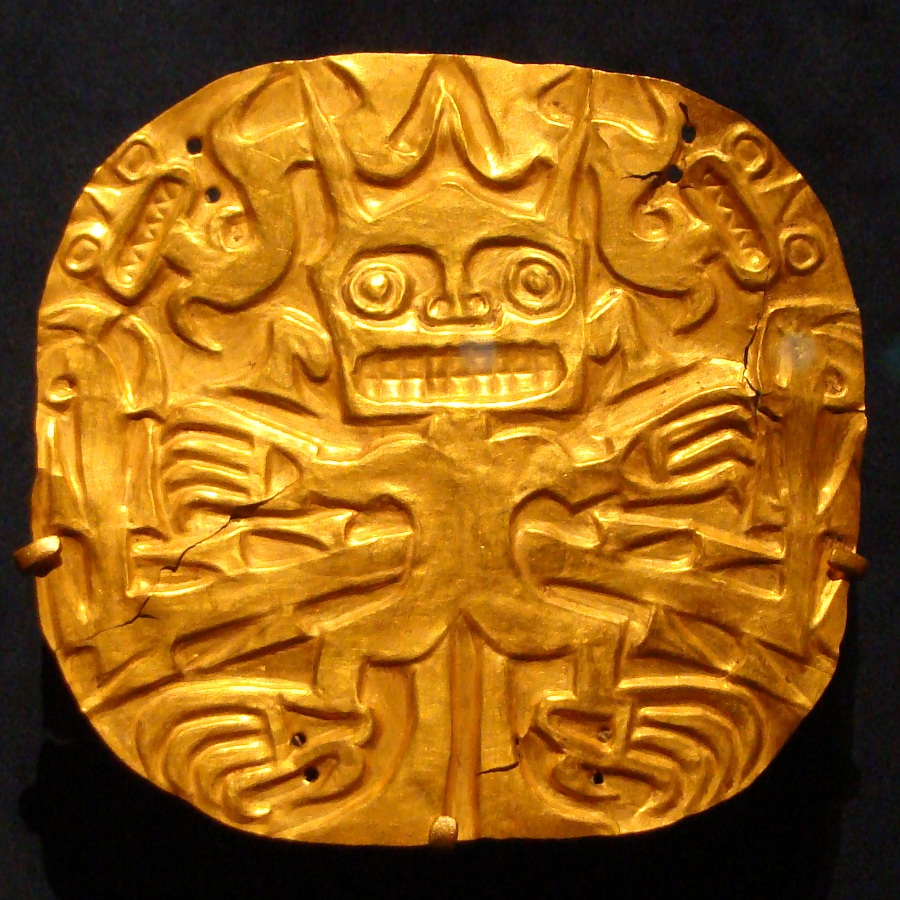The Coclé of Panama used hammering techniques to produce exquisite masks, jewelry, and pectorals such the one presented here. Many Coclé pectorals portray either pair of symmetric creatures in profile or a central figure with outstretched limbs and supernatural qualities. The big grin this fellow bears is a common element in the pectorals. Based on the large grins I have seen in masks from the Yaqui of northwest Mexico and indigenous societies from other parts of the world, it could represent the power of the supernatural being to protect the wearer against harmful, negative forces. The bizarrely shaped sharks in the upper corners could thus be additional protective spirits.