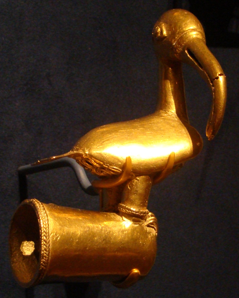 Both of these staff finials end with bird details, and Boston's Museum of Fine Arts relates them to shamanic experience. For many indigenous cultures worldwide, one of the defining qualities of shamanism is the out-of-body experience in an altered state of consciousness such a dream or a trance. The shaman's soul may feel as if it had transformed into a bird in order to fly into the spirit worlds, to communicate with gods, spirits, and other supernatural beings. They engage with the spirits in order to ensure that they provide health and abundance for the environment and the community. That moment of transformation between bird and shaman could explain the combined features in the creature at left. The bird at right comes from the Sinú River of Colombia.