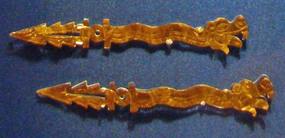 From the Aztec civilization, these golden sheets are etched into miniature rattle-staffs, identifiable by the long, barbed arrows pointing to the left. Ideally, the arrows would be pointing upward as the musician shook the staff. It was an instrument associated with especially Xipeh Toteuc, god of sacrifice and the spring.
