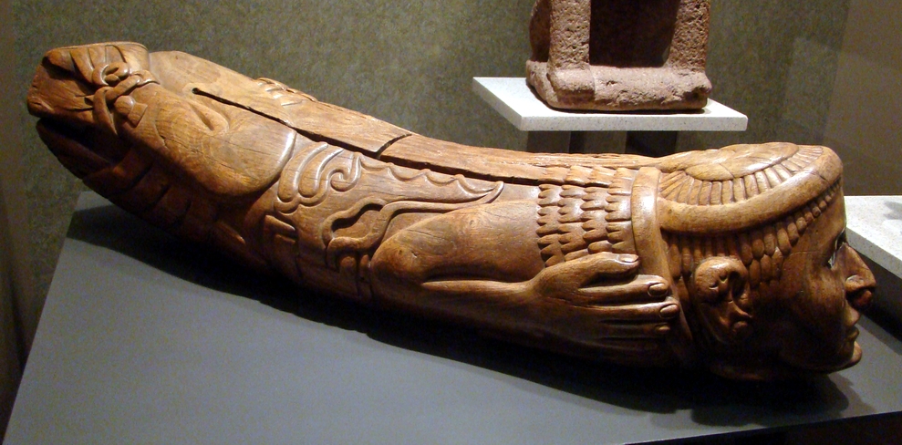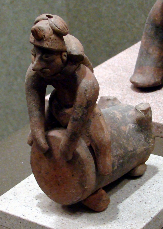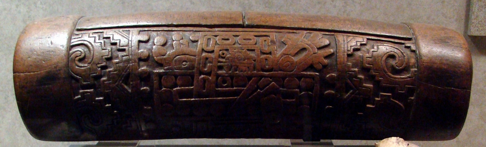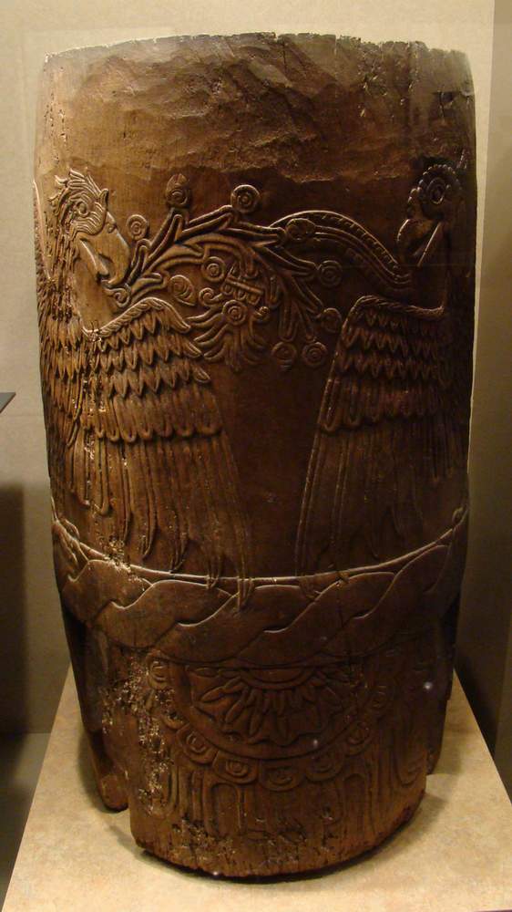 The other major wooden percussion instrument was the drum, played upon a surface of deerhide stretched across the end. The standing form is known popularly as huehuetl, such as the magnificently carved example at left from the southern Aztec region of Malinalco. Upon its length two eagles issue songs from their mouths, fluid like water (left) and aesthetic like blossoms (right). The miniature ceramic at right comes from Nayarit in West Mexico, and it depicts a drummer sitting upon a long drum as he strikes it with both hands.