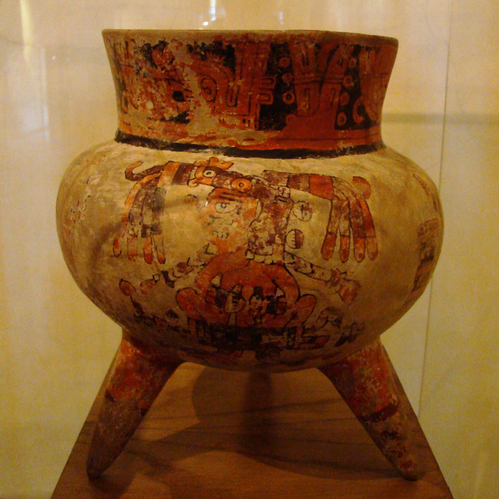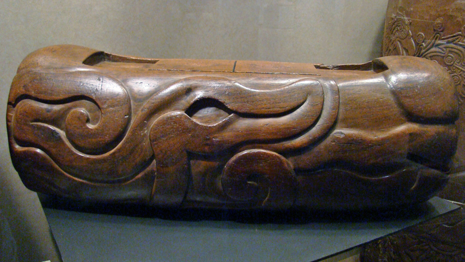 One of the most iconic of Mesoamerica's native instruments is the teponaztli, a hollowed trunk with two slats of different lengths to generate tones. At left is a spectacularly carved example from the Mixtec of Oaxaca. It is ornamented with fret and whorl designs. The ceramic vase on the right is painted with the image of a kneeling Mixtec musician, playing passionately upon the instrument with a pair of mallets.