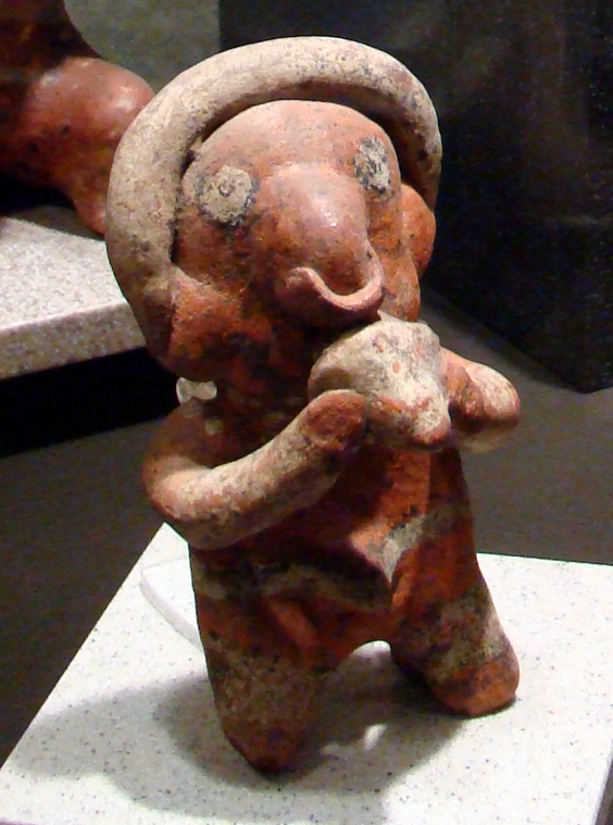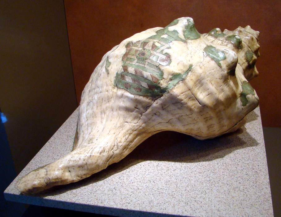 Used notably for religious ceremonies, the conch trumpet was bleated with powerful, haunting resonance. Its spiral hollow came to symbolize the lunar cycle, the circulation of breath, or the energy of life under different ritual contexts. As such, it had profound mystical connotations that were carried through its imposing tenor. This decorated conch comes from Teotihuacan. The ceramic figure at right is a trumpeter from Nayarit in West Mexico.