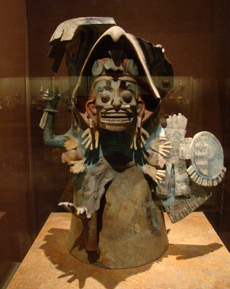 While not as grand as the standing eagle warrior figures from the Great Temple, this ceramic urn is richly painted and embellished. The face is skeletal, but it still carries jewelry like the nose piece and the small, hand-shaped earring pendants. This piece was crafted in the beginning of the sixteenth century.