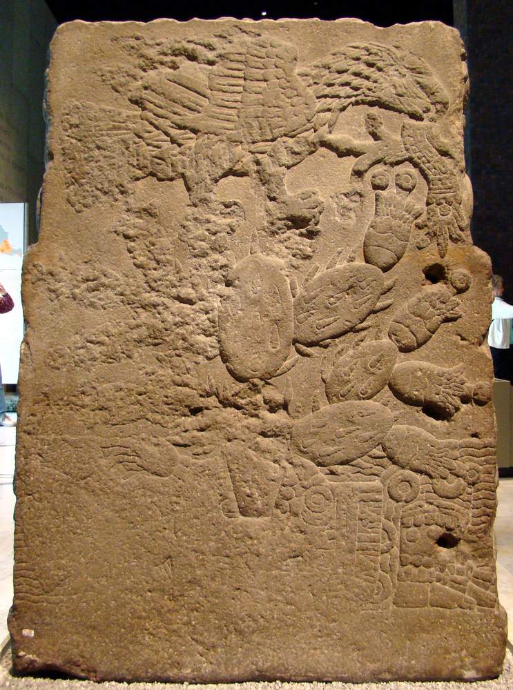 Detail of a relief from the imposingly large Stone of Tizoc. The Stone is a short but wide cylinder, whose entire circumference is marked with reliefs of the war lord Tizoc in various wardrobes, and in each battle he stands on the left and holds his prisoner by the hair, each identified with a glyph of a different conquered region. Because of his impressive military career, he was elected by the Aztec noble council as emperor, but this would become one of the shortest reigns of any Aztec emperor, from 1481 to 1486. However, an inferior eye for military command was one of the main reasons Tizoc had such a weak office. Dissent in the administration led to the eventual assassination of this emperor, but the great Stone remains. The lid to this monument has spokes which represent the sun's rays, and the central hole is open as a receptacle. This structure could have therefore served as a temalacatl gladiatorial stone: the hole at center would have supported a small pole that fastened to a war prisoner's ankle as he fought in combat.