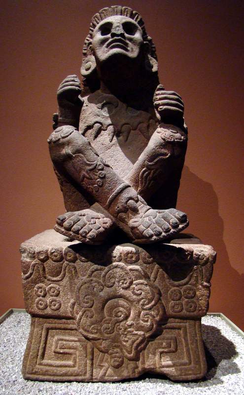 Stone sculpture of Xochipilli, the Flowery Prince, who was both a vegetation god and a god of youthful beauty. This sculpture is one of the most emotionally expressive carvings of an Aztec god. Various kinds of flower prints are carved over his skin, and many of them have in fact been identified as flowers of hallucinogenic plants. Xochipilli's image can thus integrate the colors of both the flowering plants and their visionary abilities.