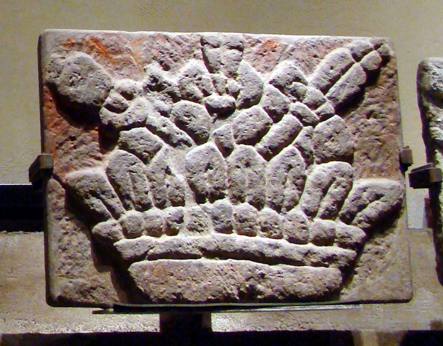 The plaque at left is carved into a relief of spears, and the one at right depicts zaca-tapayolli, a 'grass ball' into which soldiers sprinkled some of their own blood in self-sacrifice.