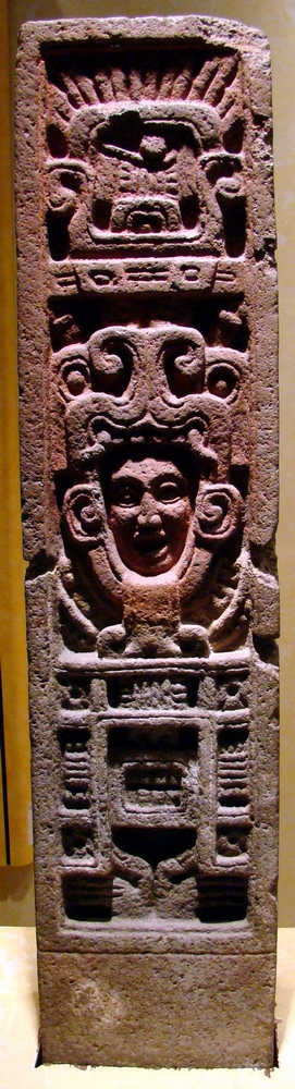 Xochicalco art is an interesting combination of styles from the Maya, Teotihuacan, and other civilizations. The city was the first place to portray the Feathered Serpent as a human and relate this god to creation myths. This pillar is one of a series of three from the site, each with a different deity's face. Here a god emerges from a beast's open jaws, perhaps a reference to the Vision Serpents that carried royal ancestor spirits in Maya religion.