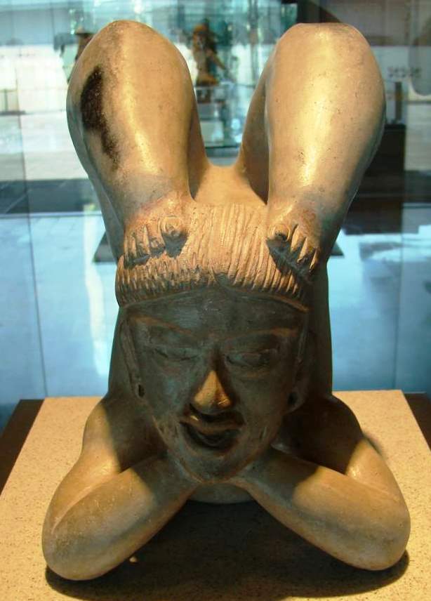 This ceramic sculpture from Tlatilco, Mexico State, is one of the most interesting works from the Preclassic period. With his spine bent completely backwards, the contortionist rests on his elbows and chest while his feet rest on the top of his head. Contortionists and dwarves have been known to serve as attendants to the ruler's court. (Dwarves were even considered sources of good luck for the reign.)