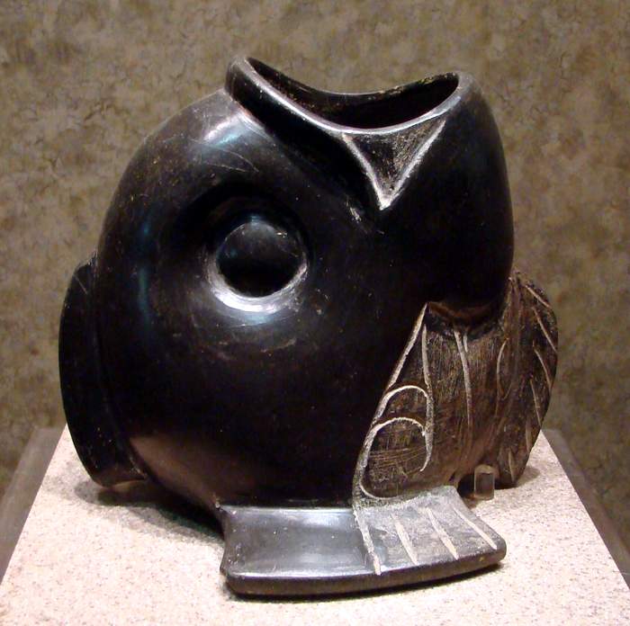 Animal-shaped pottery has very early beginnings in Mesoamerican culture - this fish vase is around three thousand years old, dating it within the Early Formative (1800-1200 BCE). The fish's head points upward; its open mouth serves as the rim. Pottery on this page is significant as it pertains to the origins of sedentary, agricultural communities. When these communities had begun to increase into densely populated centers, new food storage technology became necessary.
