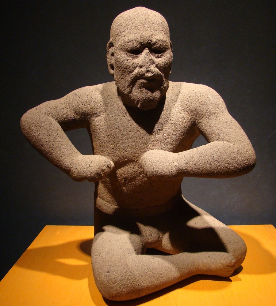 Unlike the posing or abstracted stances of humans in other Olmec works, this piece has a sense of activity and motion. "El Luchador" means 'The Wrestler,' named for the defensive posture in the arms and back. An interesting thing about this man is his mustache and goatee - these were rare in Mesoamerica, so rare that they signified nobility or even divinity.