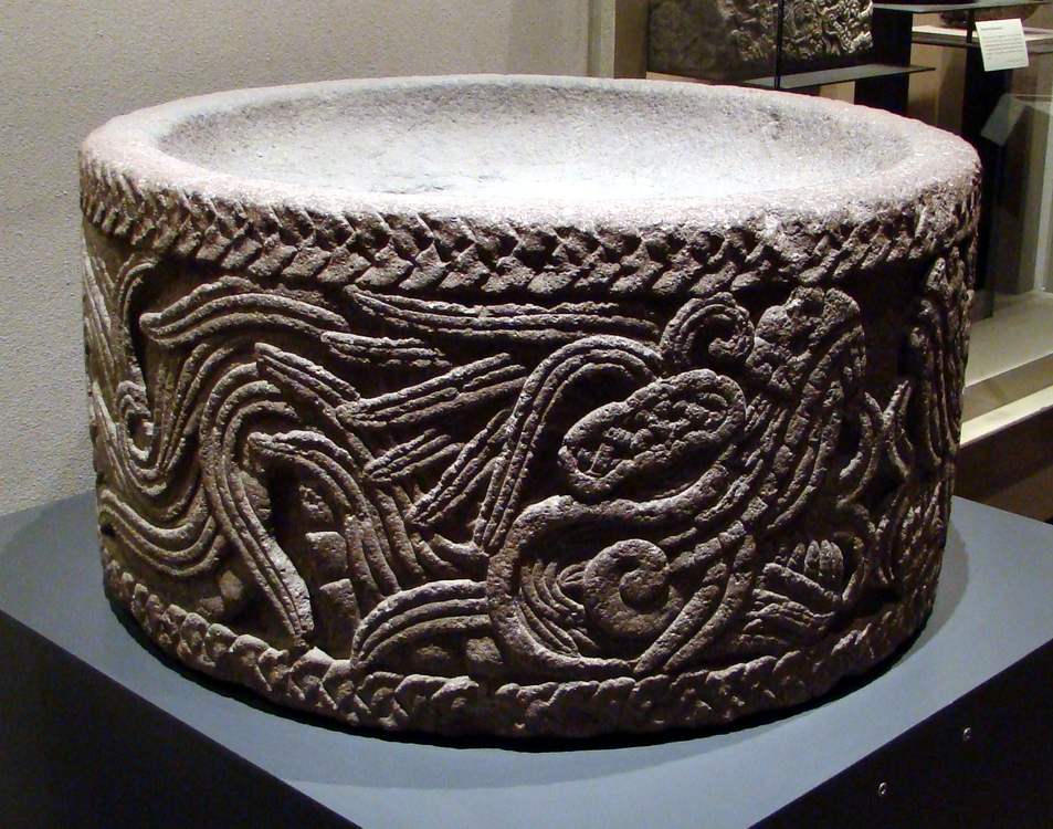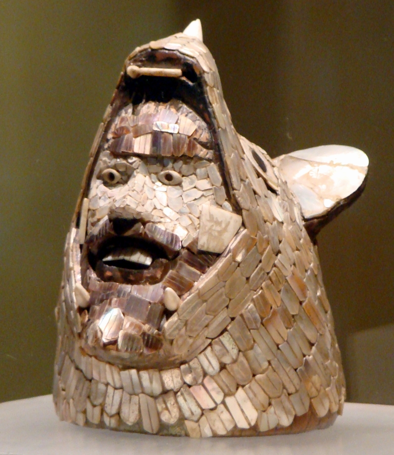 The most inspiring feature in the Aztecs' poem is the promise Quetzalcoatl makes during his exile - he would return from the eastern land of Tlapallan and restore spirituality to the followers of his god. The mosaic work here is made from carefully sculpted pieces of mother-of-pearl, inset into a wooden carving. The face has been interpreted as Quetzalcoatl emerging from the jaws of the earth, as in the Xochicalco relief above; the animal head is in fact a bat's.
