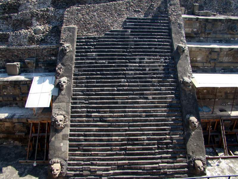 The Temple of the Feathered Serpent at Teotihuacan, alongside its full-colored replica at the NMAH. For the sake of convenience, the temple is often referred to as the Temple of Quetzalcoatl, though the use of Nahuatl at Teotihuacan is extremely doubtful. The front face of the temple still bears many of the Feathered Serpent and Rain Lord images that together signify their complementary roles of wind and rain, of life and fertility. However, it has been suggested that the front face of the temple was walled away from the city's main avenue in civil protest against the domineering hierarchy. (For a detail of the rain god's image on this temple, see the Rain of the Earth page.)