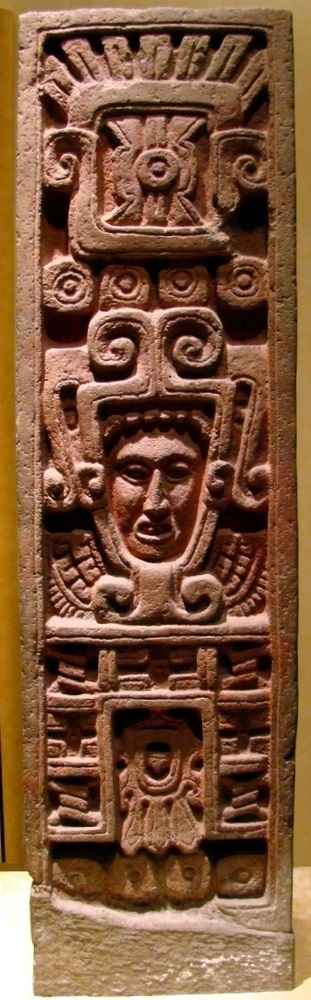 The Epi-Classic site of Xochicalco was the first to not only depict the Feathered Serpent in his human form but also to connect him to creation myths. In this pillar relief from Xochicalco, Morelos State, the god's face emerges from the surrounding jaws of the earth. Above the jaws are four dots and the sign of Movement that signify this present solar age. The Feathered Serpent is thus linked to the creation of the current earth and sun.