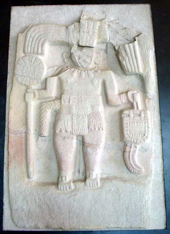 The main figure in this relief sculpture is a deity with a prominent volute and ringed goggles around the eye and large upper fangs from the mouth, recalling the rain god Tlaloc. What is noteworthy of this image is how it stands atop a great serpent, which many Mesoamerican myths commonly understood as the earth's surface. It reinforces the spiritual connection between rain and earth.