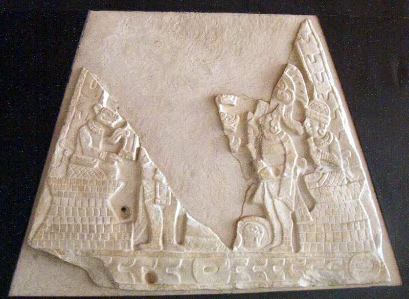 This fragmentary scene appears to be taking place within a ball court, between two parallel structures demarcating the sides of the field. On the left side is a curious figure that might be the dog-headed deity Xolotl, known for his association with the ball game. On the right are two figures, one seated atop the right building and the other standing within the court playing field. Toward the center and on the floor is the ball, with a blurred skull relief, the skull facing a decapitated ball player whose blood spews into serpent streams. The motif is too similar to the reliefs at the ball court at the Maya site of Chichén Itzá to be coincidental.