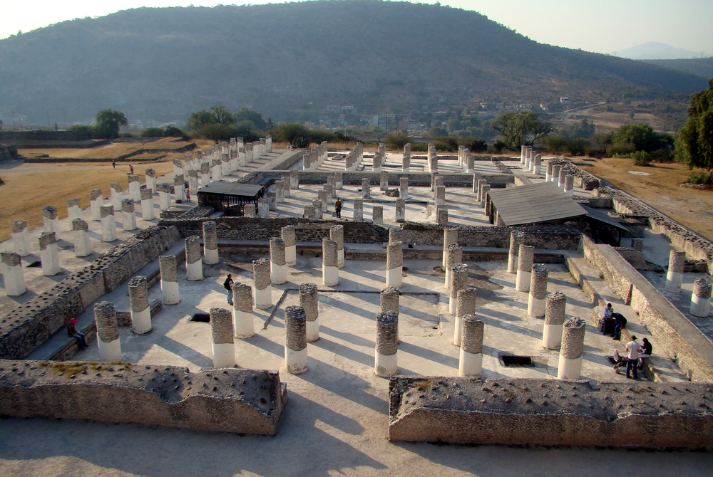 One of the most important changes that took place during the Post-Classic period was a widespread shift in political organization toward a council of delegates (with a sovereign kingship still in place). Architecture in the center of Tula followed this turn toward council, especially at the "Burnt Palace" beside the Venus Temple. Taken from atop the temple, this photo shows a set of benches within the perimeter, where the delegates would sit upon mats to discuss political matters.