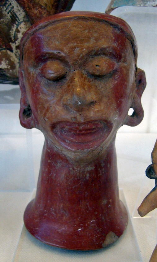 These two ceramic figures come from the state of Puebla. Both emphasize the mask of skin with heavy eyelids and the god's actual mouth behind the pulled lips. Rust-colored bands also descend along the temples and cheeks.