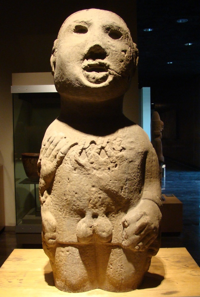 This life-sized sculpture has a quite intriguing history. According to the site museum of the Aztec Great Temple, the sculpture's stylistic features suggest an original make by the Zapotec of Oaxaca around the year 700. When the Aztecs began demanding taxes from their subject provinces, the Zapotec must have offered this along with other material resources for the empire. Archaeologists discovered this magnificent piece at the site of San Mateo Tezoquipan, near the former Aztec city of Chalco, Mexico State. The nose ornament, collared shoulders, and heavy eyelids recall the Teotihuacan statue above.